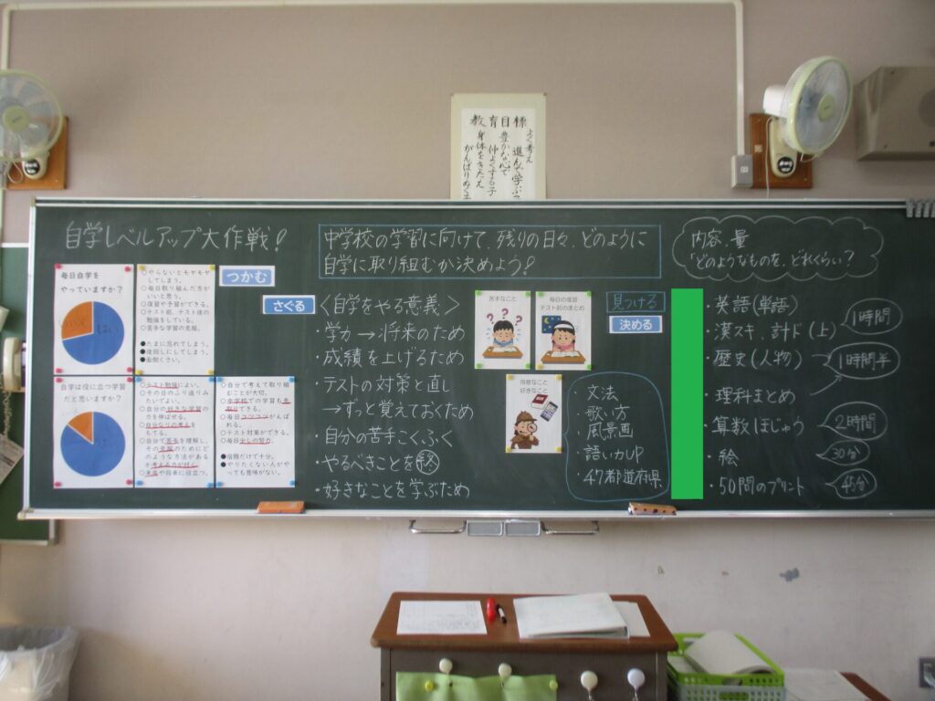 学年学活~最後のスタディーウィークに向けて~ 2026年2月12日 最終更新日時 : 2026年2月12日 kumagaya_author 本日、1,2組合同で学活の授業をおこないました。 自主学習の目的や意義を全員で共有しながら、最後のスタディーウィークに向けて個人の目標を立て、学習計画を立てることができました。
